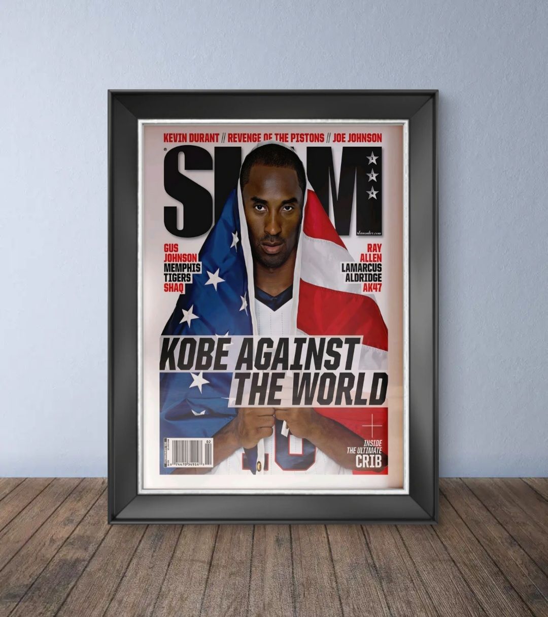 The framed picture is the cover of SLAM Magazine Issue #114, released in February 2008. Issue Details Featured Athlete: The cover features NBA legend Kobe Bryant of the Los Angeles Lakers. Headline: The main headline reads "KOBE AGAINST THE WORLD". Visuals: Bryant is shown wearing a Team USA jersey, with the American flag draped over his shoulders. Other Players Mentioned: The cover also lists several other NBA players and topics, including Kevin Durant, Joe Johnson, Ray Allen, LaMarcus Aldridge, and the "Revenge of the Pistons".