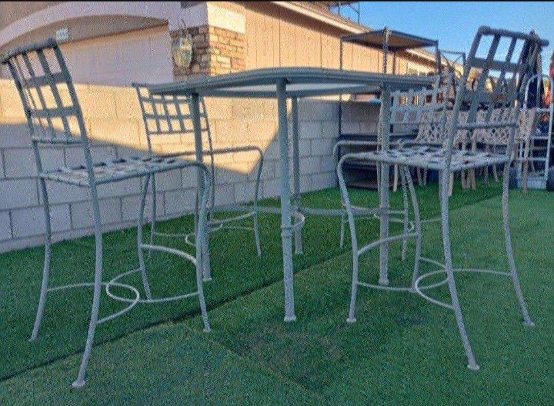 Classic patio furniture in good condition. The table measures 42 x 42 x 40 cm high and includes four high stools.