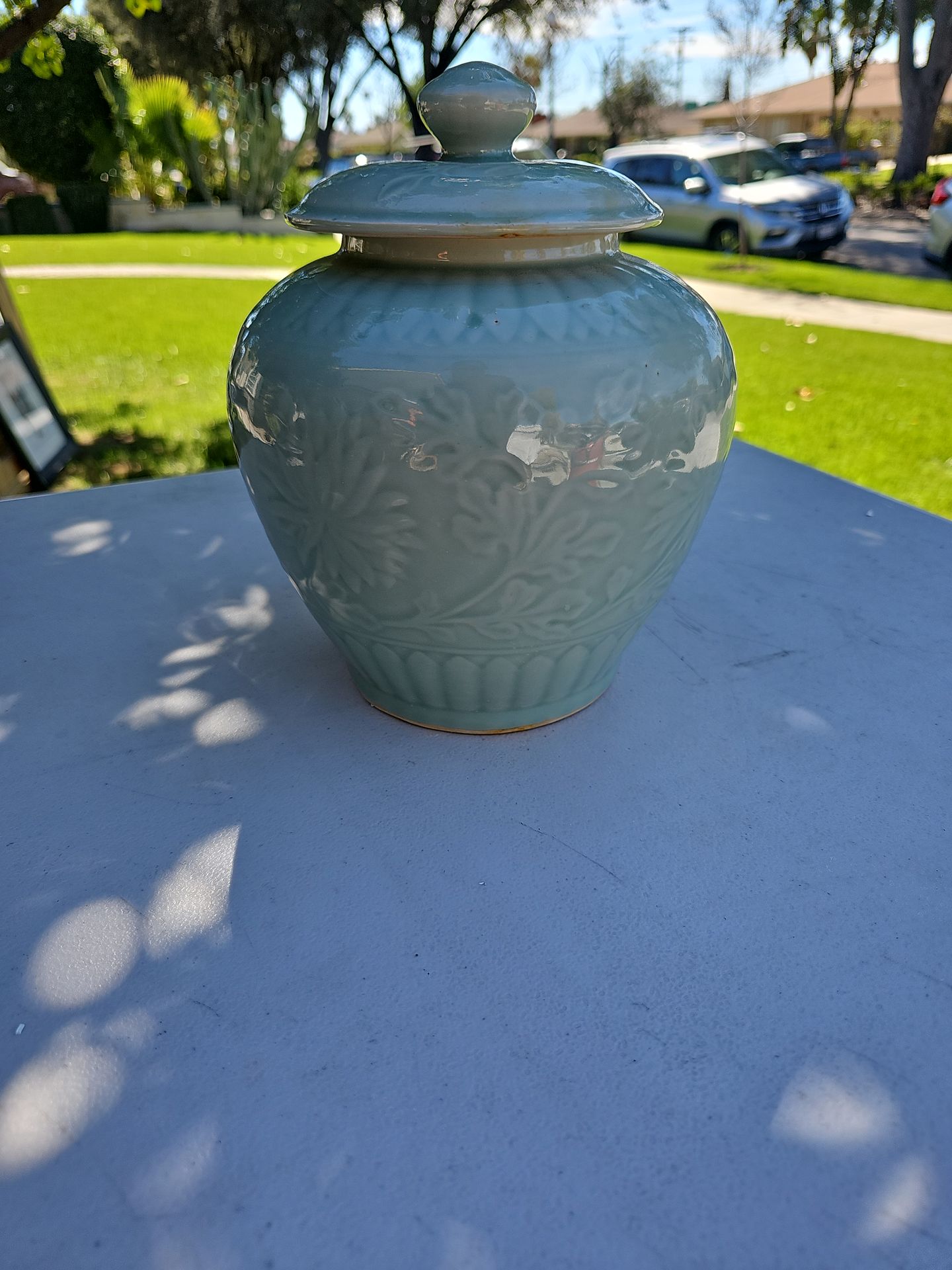 Beautiful ceramic jar with lid featuring embossed floral design. Great for kitchen storage, sugar, candy, or decorative use. Good used condition with normal wear. Clean and ready to use. $10 takes it – must pick up.