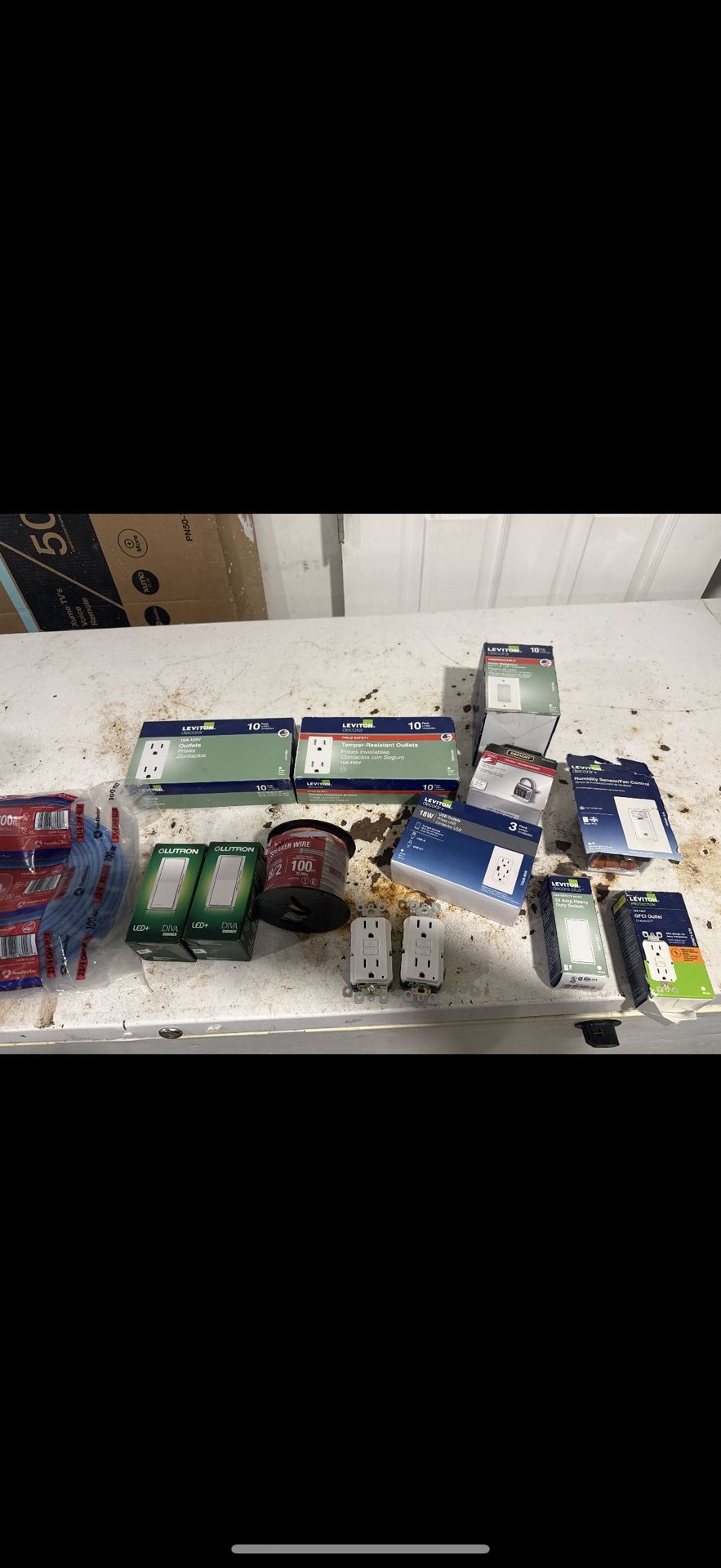 You can take everything for 600 or buy individual I have about 15 of 20 amp GFCI outlets from Leviton. They’re not in the package but they’re loose brand new though never use. 20 bucks each 20 bucks for each of those Nutron LED Vida dimmers W USB-C outlets. 20 bucks each I have 25 of them for them as well single though individuals this 18 W one is a three pack.25 dollars Doorbell chime transformer 25. 15 dollars for the 10 pack of 15 amp temper resistant outlets each I have two of those 25 bucks for the humidity cencer fan