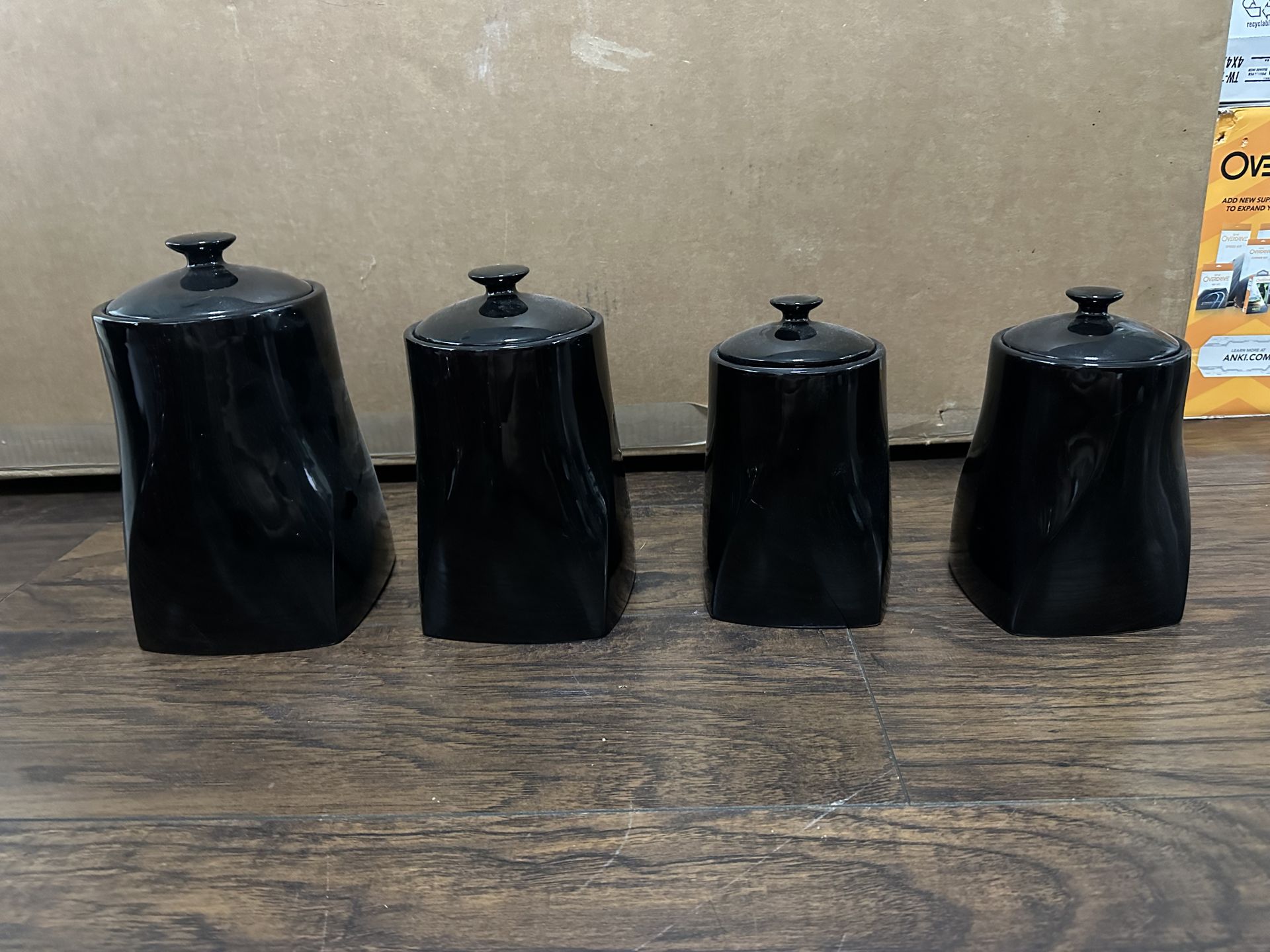 This set of glossy black ceramic kitchen canisters features a modern, slightly concave hourglass shape with matching lids and knob handles.