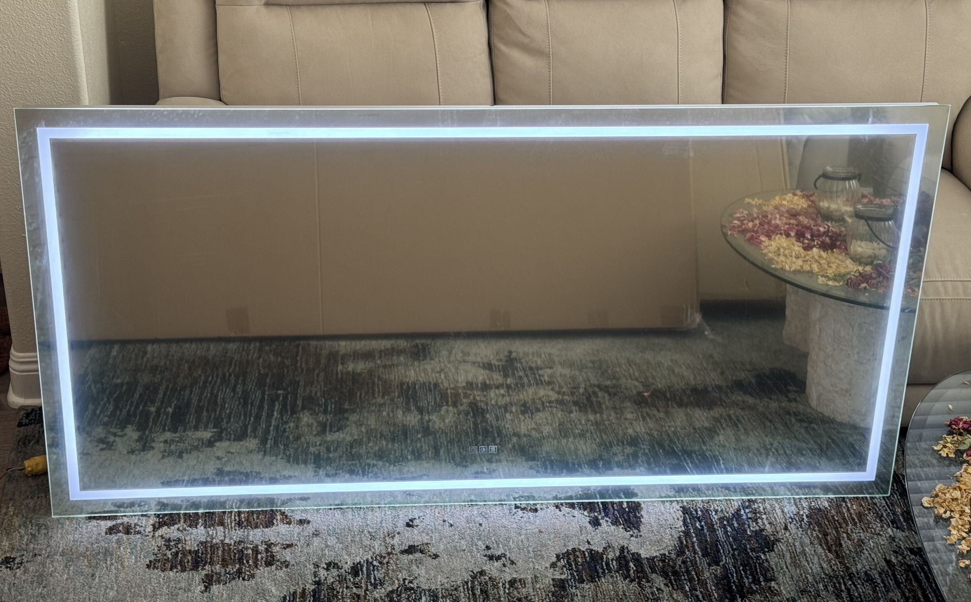 New in box, open to take pictures. Very elegant mirror, will lite up anywhere you put it . Still has film on the mirror once taken off, it will reflect much more than what the picture shows
