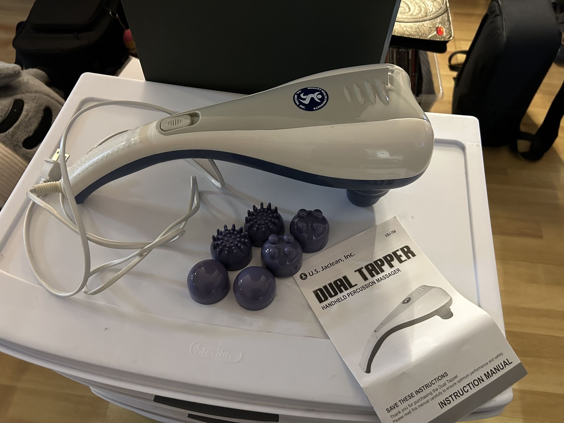 Handheld dual tapper percussion massager in good working condition. Powerful, simple, and effective for muscle relief. • Dual tapping percussion action • Interchangeable massage heads included • Variable 2-speed control • Ergonomic curved handle for neck, shoulders, back, legs, etc. • Plug-in electric (no dead batteries to deal with) • Includes massager, all attachments, and original box/manual Light cosmetic wear from normal use. Fully tested and works as it should. Great for muscle tension, soreness, or general relaxation. Cash or Venmo.