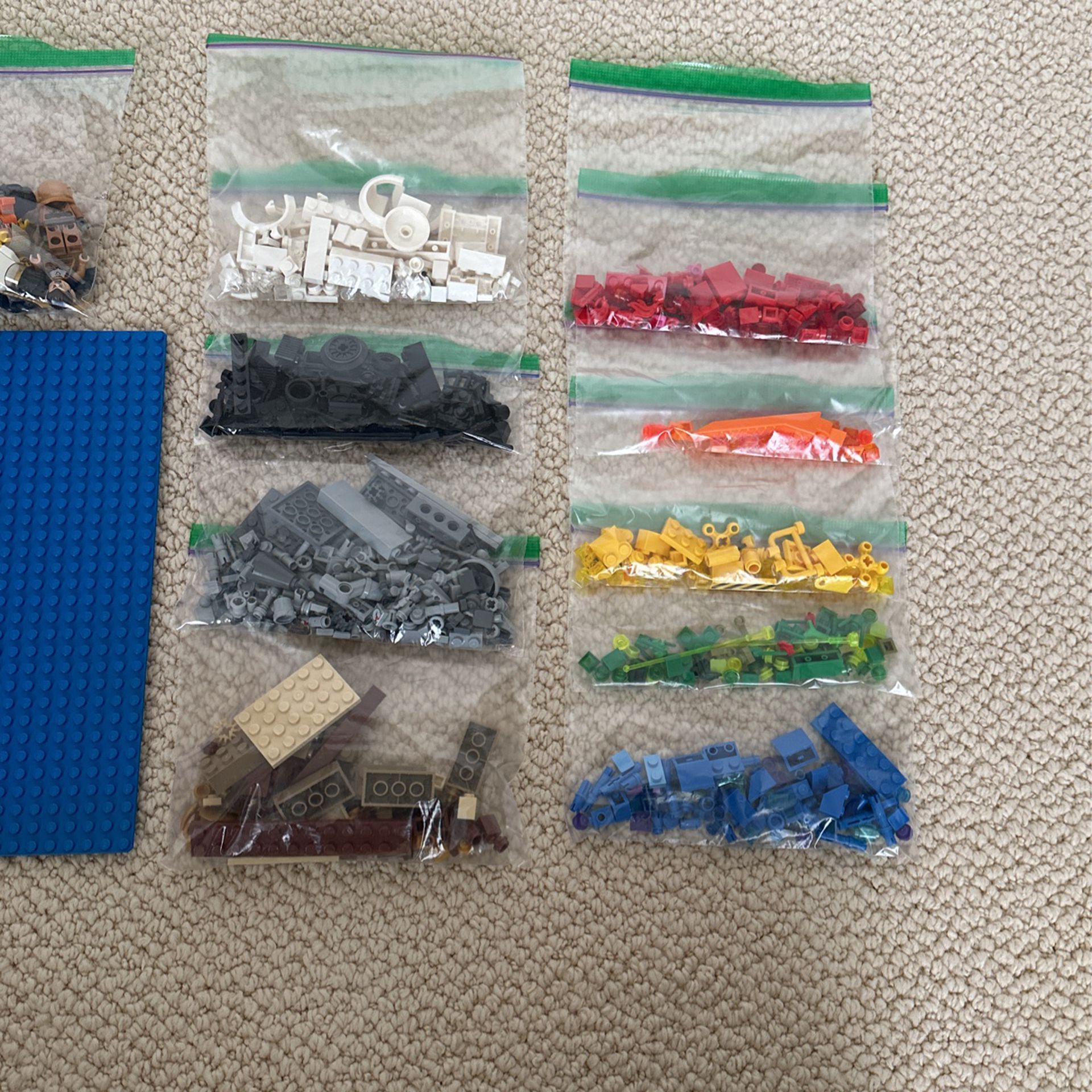 Various Lego pieces, sorted by color plus large square base and tools to take pieces apart. *Does NOT include minifigures seen in the photo