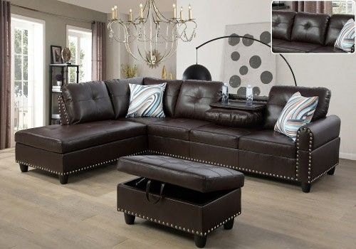 Dimensions are Length:102" Width:75" Height:33.5" 3pc Sectional Sofa,Chaise,Storage Ottoman and 2 Free Throw Pillows Sectional has a drop down table with built in cup holders and a nail head trim I Can Deliver To All Surrounding Cities Or You Can Pickup In Puyallup Same Day Delivery Is Available I Can Remove Any Old Furniture For A Small Fee
