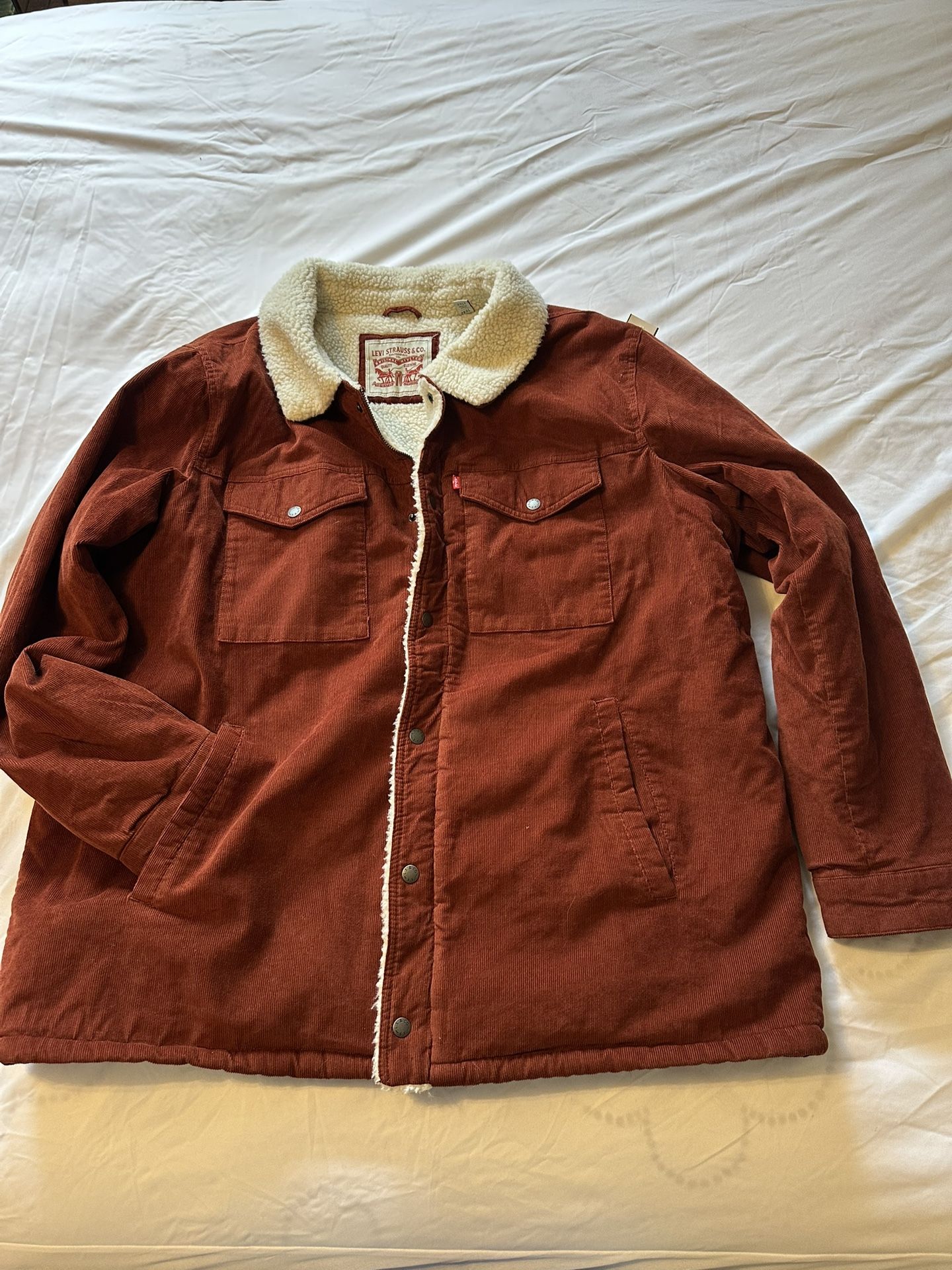 Levi Strauss men’s corduroy with Sherpa lining, zipper with snap front closure coat or jacket. Men’s 2XL. In a rich dark rust color. In great condition. Zipper and all snaps function like new, 31 1/2 long. No smells. Non smoking pet free. Asking $50.00 Venmo or cash only. Serious offers only please. Must pick up near 28 & E. Burnside. No deliveries or mail. Thank you for looking.