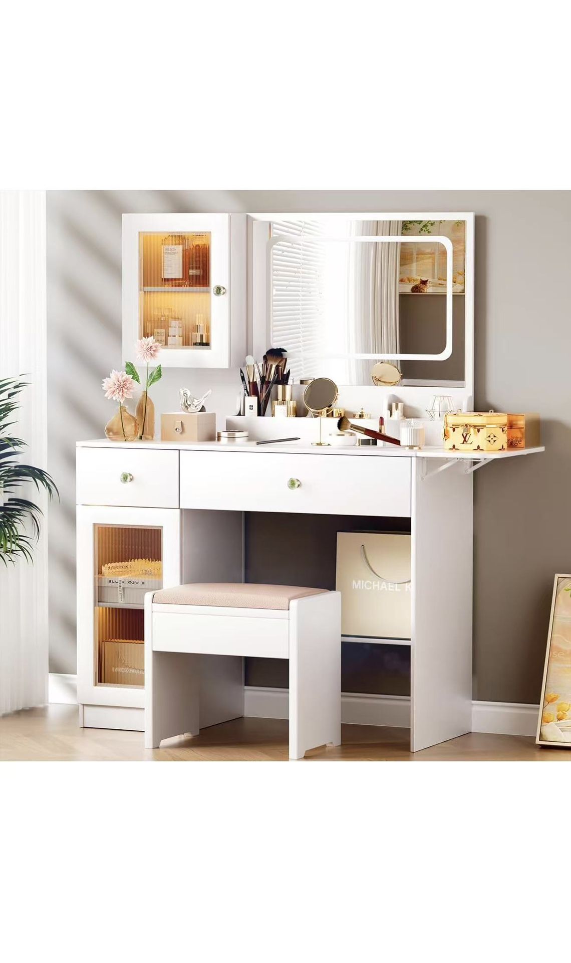 Vanity Desk with Mirror and Lights, Makeup Vanity Desk with Lights 3 Colors, White Vanity with 2 RGB Tempered Cabinets and Power Outlet, Dressing Table Vanity Stool Makeup Vanity Set for Bedroom$120