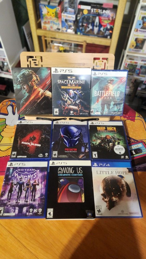 Space marine gold edition -$120 *new sealed Battlefield 2042 new sealed w/ steel book - $25 Deep rock new sealed -$15 Little hope new sealed -$15 Back 4 blood new sealed -$15 Predator hunting grounds new sealed -$25 Gotham knights -$10 Among us crewmate edition- $15