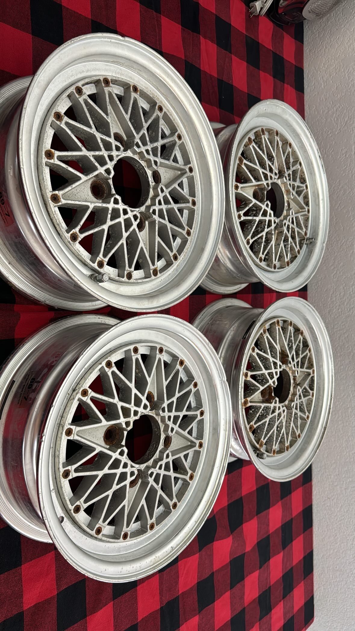 12 inch for mini cooper , morris mini, Austin mini . Lug pattern 4x101.65 They’re 12 and the width I’m not sure . Might be 5.5 , I also don’t know the offset . On my mini cooper they sit flush . These are hard to find now days . FIRM $850 FIRM Last two pictures are from google just to get an idea of how they’ll look fully restored