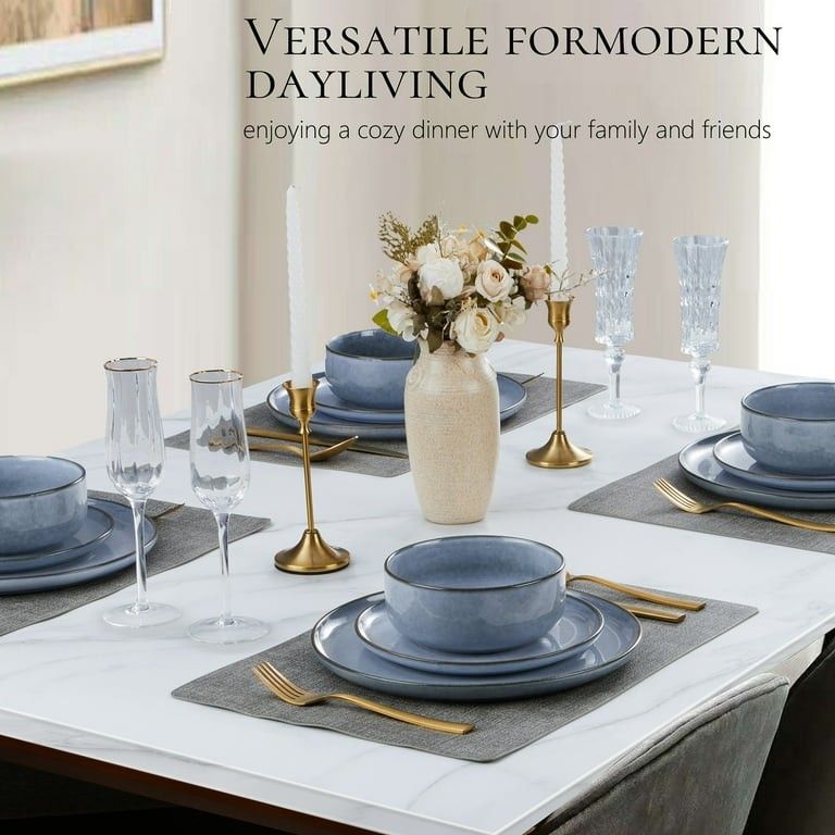 Vesteel Dinnerware Sets for 4, 12-Piece Stoneware Dish and Bowls Set, Handmade Reactive Glaze Coupe Plates Set, Chip & Scratch Resistant - Uranus Blue