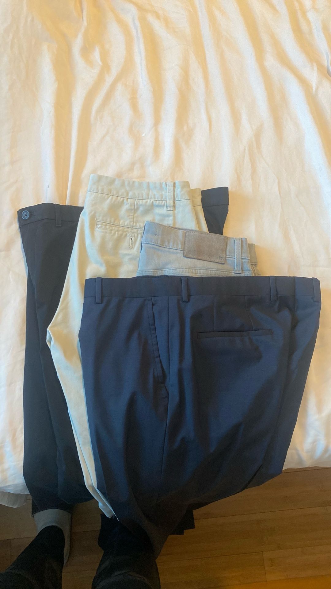 Four pants: one grey and one black dress pants, one white khaki and one grey denim.