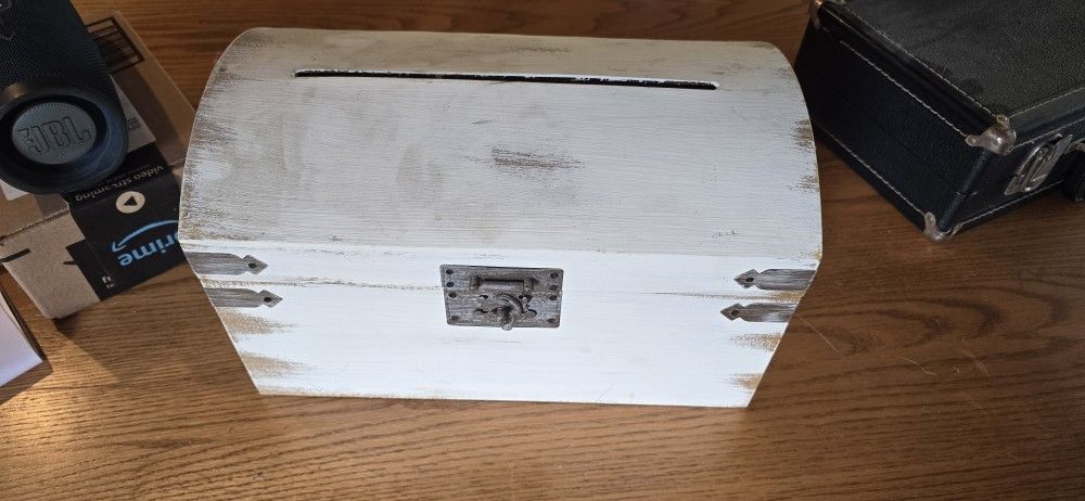 Rustic white card holding box with card slot on top. Has a latch.