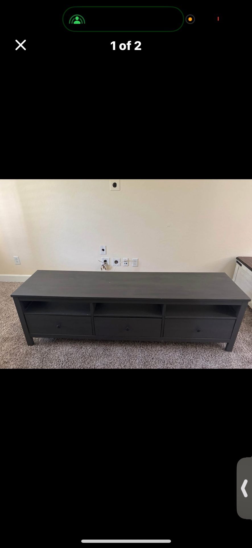 Dark blue/grey. Some normal wear and tear and a shelf that could use one more peg. 6 ft long, 22” tall, 18” deep.