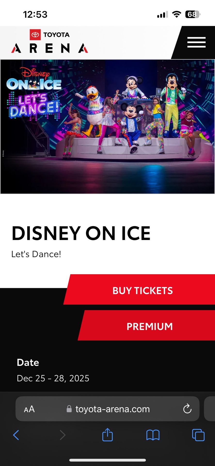 12/26 - 2pm 12/27 - 3pm 12/27 - 6:30pm 12/28 - 11am 12/28 - 6:30pm READ THE DESCRIPTION BEFORE MESSAGING WITH QUESTIONS. Price listed is per ticket your suite ticket also includes admission to VIP Club, enter the arena from the VIP Club. Most events complimentary appetizers and pastry desserts in the VIP Club. E tickets will be transferred through Ticketmaster. If bought tickets separately yes you will be in the suite with other people. These are skybox suites. 20$ VIP parking pass Message for whole suite pricing