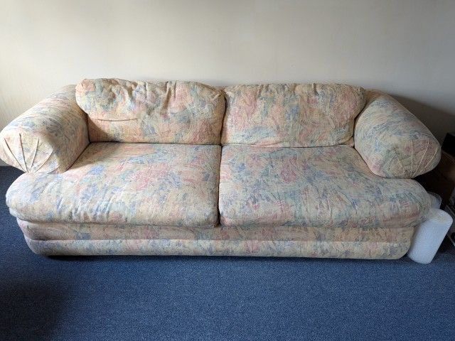 Price is FREE. Just have to pick up. Measurements: 96"W x 42"D x 34"H Comfortable couch with a soft, floral patterned upholstery in shades of pink, blue, and beige.