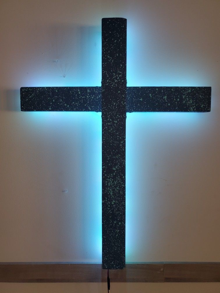Elevate your space with this stunning, artisan-crafted backlit wooden cross. Meticulously built with a focus on durability and high-quality craftsmanship, this 3-foot tall by 2-foot wide statement piece is designed to be a centerpiece in any home, church, or office. Includes * Led wireless remote with 16 different colors and 4 different light modes and dimmer. * 6ft extension cord * Hanging hardware pre insalled. * USB to A/C adapter block