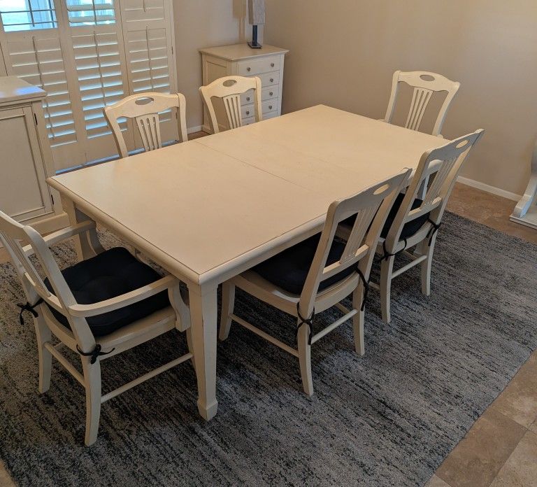 In good condition with no significant blemishes. Ivory farmhouse style dining set -- table and 8 chairs (two more chairs that are not in the photos). Table, with the leaf in as pictured, is 72" long. Located in Mesa near Gilbert rd and University. Check my other posts for more great stuff.