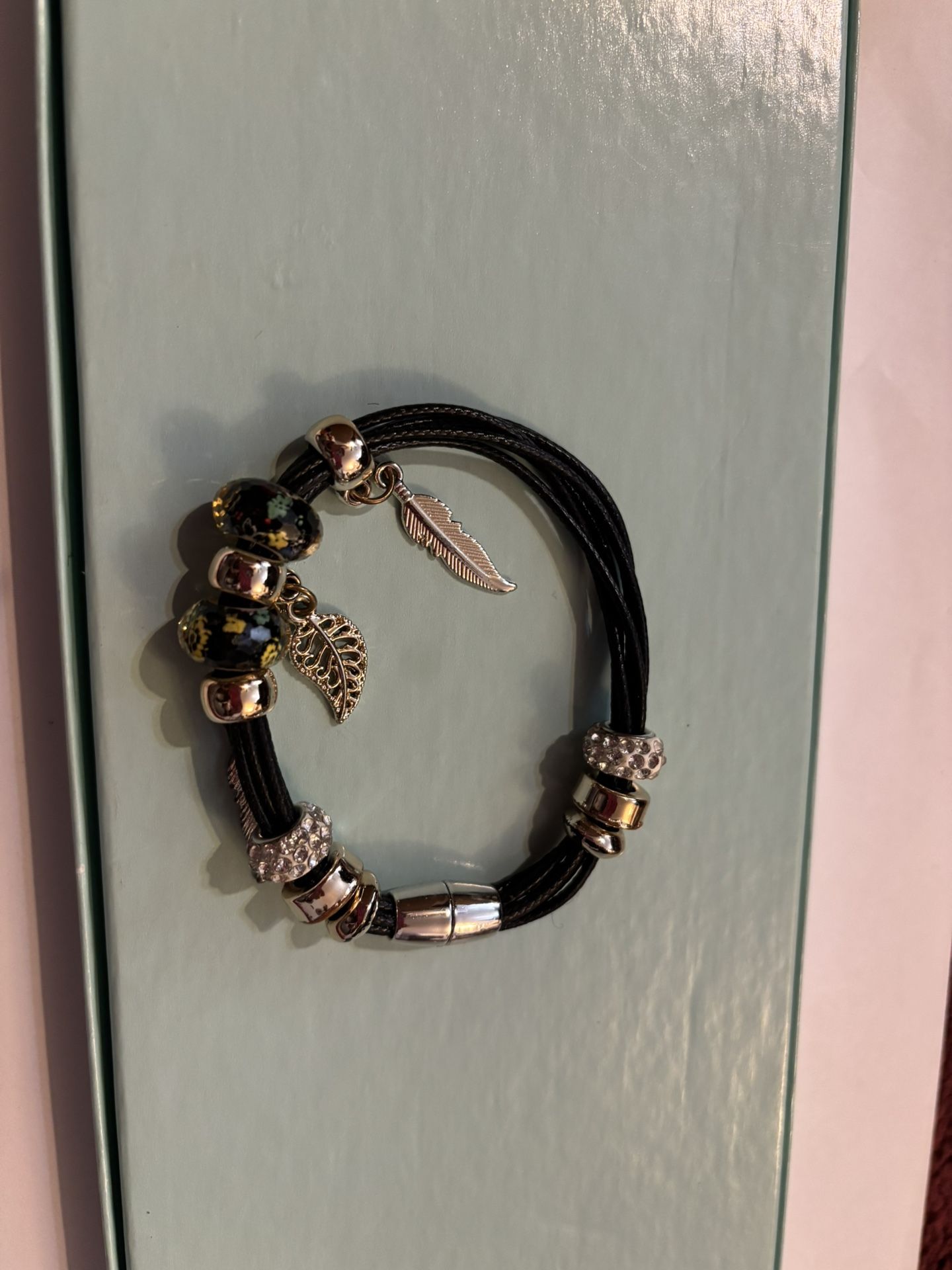 Add a touch of sophistication and charm to your accessory collection with this elegant multi-strand leather bracelet. Featuring beautifully detailed charm beads and a dangling feather pendant, this bracelet combines simplicity and luxury. The magnetic clasp ensures easy wear, while the mix of metallic tones and intricate bead designs makes it perfect for both casual and formal occasions. Whether you’re dressing up or keeping it simple, this bracelet will elevate any outfit. Makes a thoughtful gift for friends or loved ones.