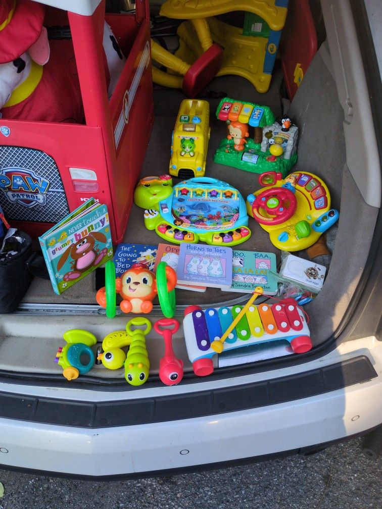 3. VTech educational toddler toys 1 LeapFrog toddler school bus 5. Hardcover toddler books 1 xylophone and 4 handheld small shakeable music toys 1 rolling monkey 1 educational alphabet card game All of which are in good shape, clean, working and nothing on them is broken, stained or worn Although the battery covers to the four larger toys are missing We used tape to cover the area to keep the battery in, they do not come with batteries I'm asking $5 per toy or $45 for all of it