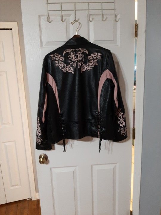 Beautiful black leather with pink inlay. Inside and outside pockets. Missing zipped in liner but never needed it riding in Florida. Very unique