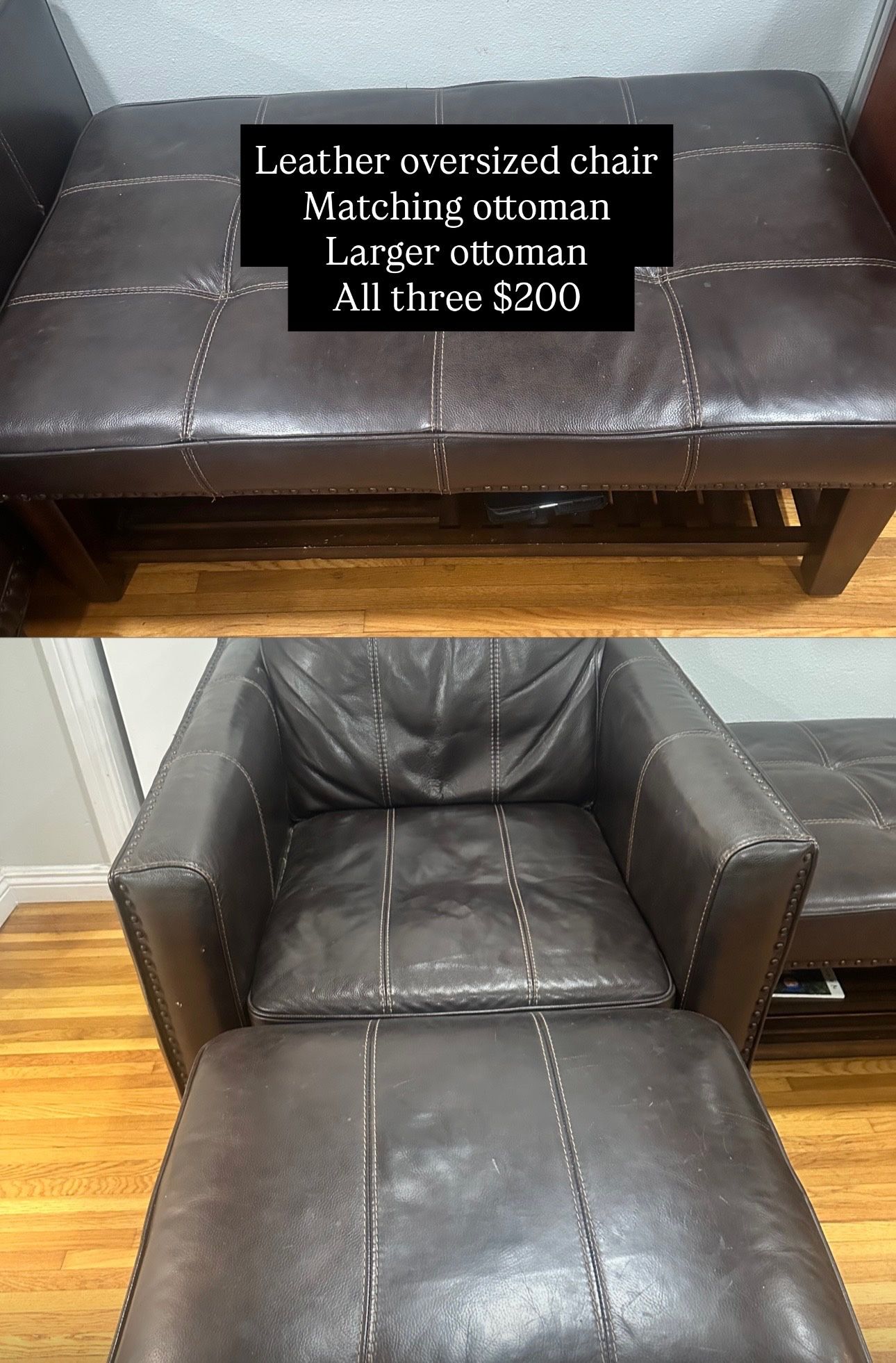 Oversized leather chair with matching ottoman, and matching large ottoman.