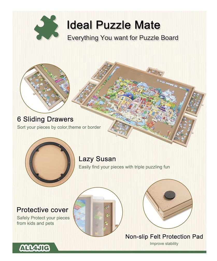 If you like doing puzzles you need this! Large puzzle tray for up to 1500 piece puzzle. Includes trays to keep pieces sorted and organized, Lazy Susan base for rotating the board, and sturdy translucent overlay to keep dust off and protect unfinished work. This has never been used - excellent condition! Additionally there are 2 puzzles that have never been opened to go along with this.
