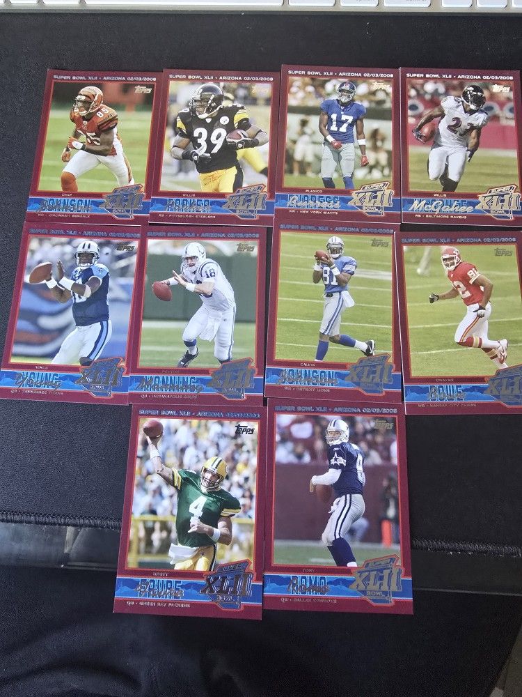 10-card lot from 2008 Topps Super Bowl XLII set (Giants vs Patriots). Numbered 999/1000 Includes star players like Peyton Manning, Drew Brees, Calvin Johnson, Tony Romo, Plaxico Burress, and more. Cards are in good condition overall. Great lot for collectors, set builders, or resale. Asking $25 obo