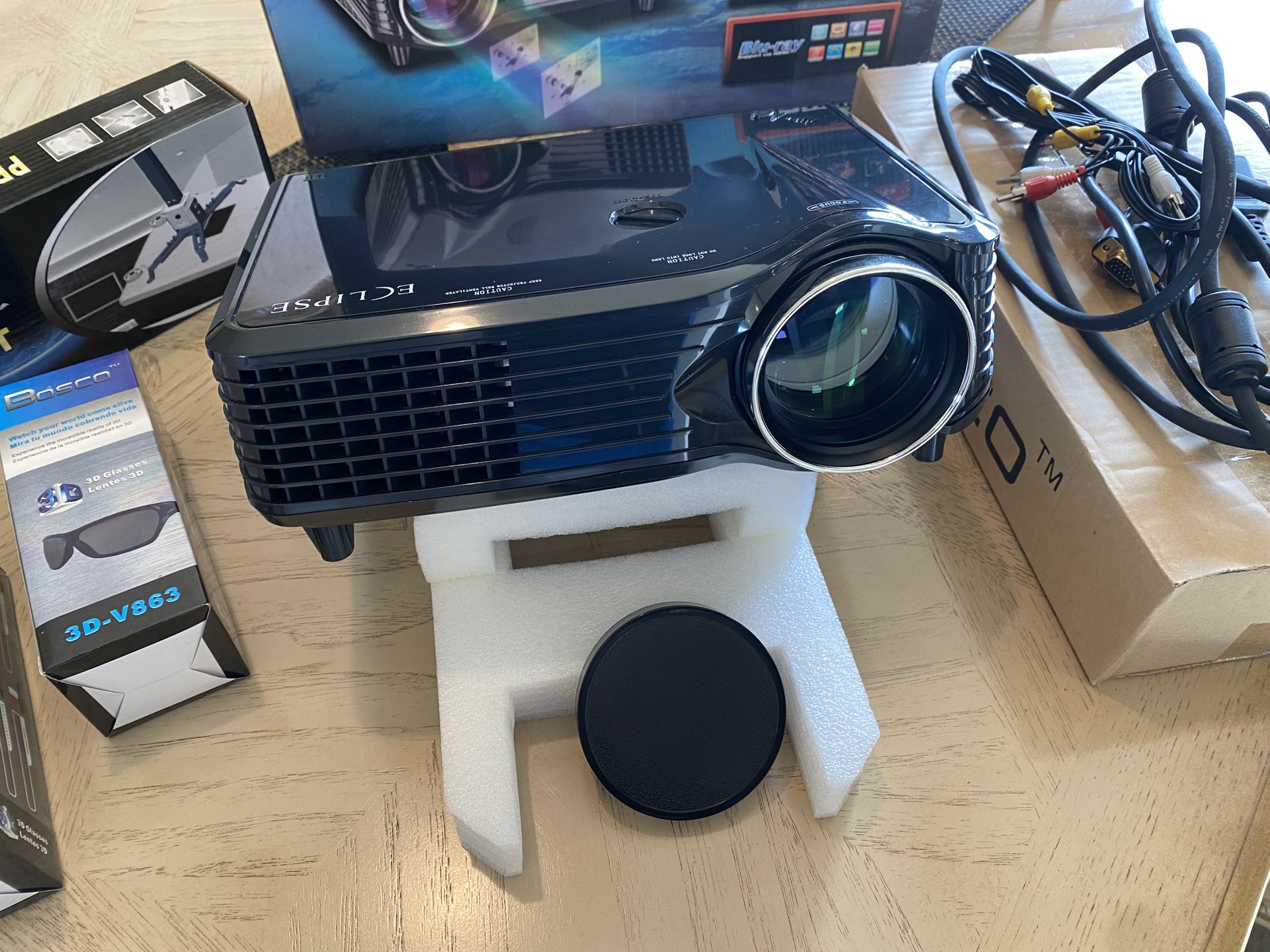 Very nice Eclipse 3D model #4777 LED home cinema theater system. Pretty much brand new, purchased it to use in a home theater room and never did, used it one time for birthday party slideshow presentation connected to an Apple laptop. Comes with the entire kit, built-in TV tuner, all power and connection cords, ceiling mount, 3-D glasses, HDMI, original packaging/box etc. Perfect for home theater, sports, outdoor backyard TV viewing, den, portable tabletop, office/meeting setting. From clean, pet and smoke free home. Paid MUCH MORE. Also have brand new white projection screens that I haven’t posted yet. *Open to TRADES, something of value, no junk, what do you have? Send details and pictures.
