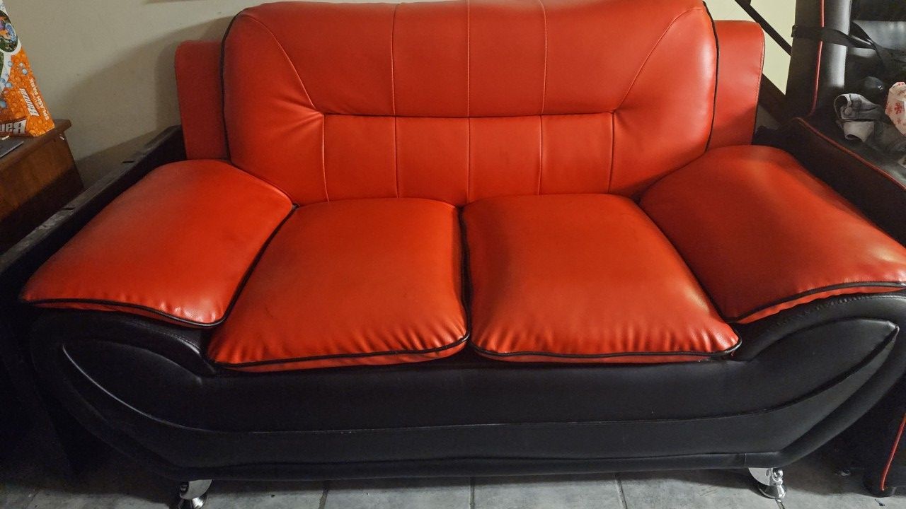 Slightly used red leather couch. Small discoloration spots but still in great shape.