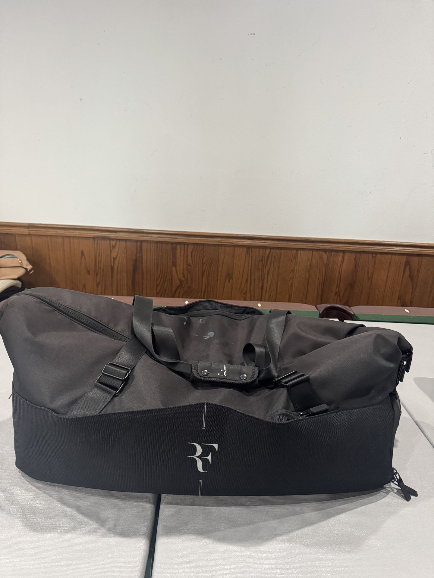 One year old, a little dirty but I’m sure one wash or dry clean session will clean everything right up Holds 6 rackets, space for balls and clothes, and a shoe compartment. No longer need because I got a new bag for Christmas.