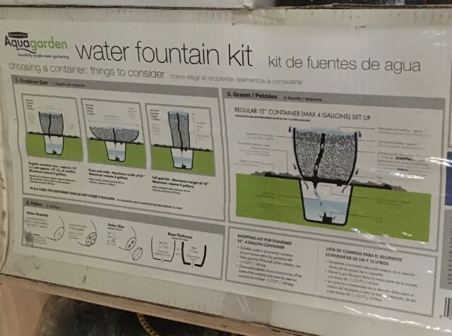 This kit is for creating the illusion that the water from your fountain soaks into the ground. You bury the basin into the soil, place the pot/vessel of your choice on top of the basin attach the included hose,plug, and pump... Instant Fountain!! New Never Used - In box