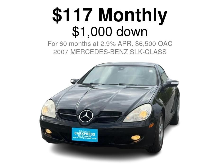 2007 MERCEDES-BENZ SLK-CLASS REAR WHEEL DRIVE with powerful 3.0L DOHC SMPI 24-VALVE V6 engine and driven only 118733 miles! Fully loaded and much more! All of our used cars carry your choice of a 90 Day unlimited mileage value limited warranty OR a 6 months 7500 mileage power train, Extended Warranty & Financing Available for all types of credit. ** Contact our Sales at 540-216-7123 SE HABLA ESPANOLTerms of Sale Overview: We reserve the right to end this listing at anytime should the vehicle no longer be available for sale and sales prices are subject to change without notes.Fees and Taxes: All vehicles sold are subject to $499 dealer processing fee. This represents the costs incurred with inspecting, cleaning, and adjusting vehicles. This fee also covers preparation of all documents, as well as all costs incurred with shipping of paperwork. Buyers are responsible for all state, county, city taxes and fees, as well as title/registration fees in the state that the vehicle will be registered.Accepted Payment Type: Cash/Personal checks (in person), certified check, bank transfers, EFT or 3rd-party financingDISCLAIMER: NEITHER THE DEALERSHIP NOR DEALERSCLOUD.COM IS RESPONSIBLE FOR TYPOGRAPHICAL ERRORS, MISPRINTS ON PRICES OR EQUIPMENT. ONLINE PRICES REFLECTS REBATES & DISCOUNTS. SPECIAL INTERNET PRICING IS BASED ON ONE TIME PAYMENT OF CASH, CERTIFIED FUNDS, MONEY ORDER AND EFT's. TOTAL PRICES ON VEHICLES FINANCED MAY VARY. ADVERTISED PRICE INCLUDES $750 MILITARY DISCOUNT. OUT OF STATE BUYERS ARE RESPONSIBLE FOR THEIR OWN STATE TAX, TAGS, INSPECTIONS AND EMISSION. 3 OR 6 MONTHS WARRANTIES ARE THRU A 3RD PARTY VENDOR. THERE'S NO DEALER WARRANTY OFFERED. WE FINANCE PEOPLE WITH ALL TYPES OF CREDIT. EVERYONE IS APPROVED.