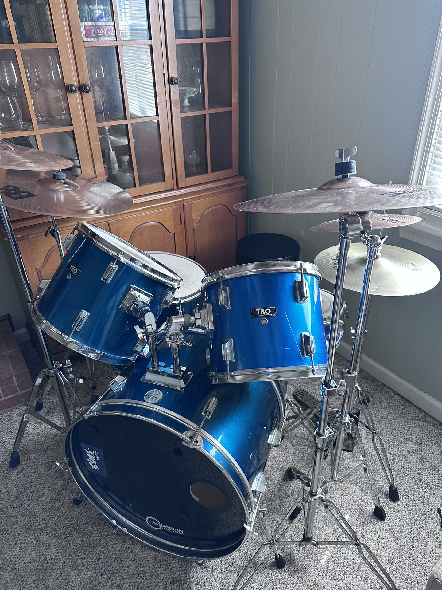 5 piece drums sabian b8 series crash, rock crash, splash, and ride. Zildjian A custom hi hats. Drums just need new heads but they’re tuned and it sounds great. Full mute set, percussion table, stick holder with new sticks, and various accessories.
