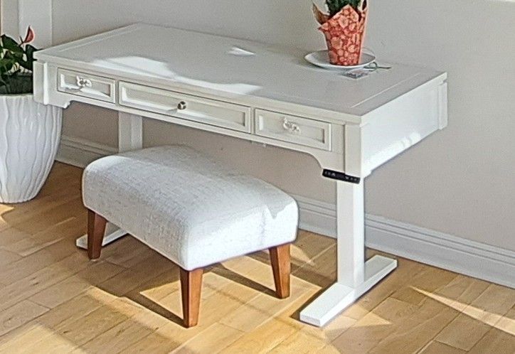 Parker House® Boca 57" Power Lift Desk - Like New Condition - $490 Transform your workspace with this beautiful sit-to-stand desk from Parker House's Boca collection! This commercial-grade power lift desk combines style and healthy ergonomics in one stunning piece. Features: Power Height Adjustment: Smooth dual-motor system adjusts from 29.5" to 55" Weight Capacity: 100 lbs 3-Position Memory: Programmable presets save your preferred heights Integrated Power Center: Built-in dual AC outlets and USB ports for convenient charging Storage: Includes storage drawer, drop-down keyboard drawer for organization Premium Construction: Poplar solids and birch veneers in Cottage White finish Dimensions: 57"W x 27"D Model: BOC#257T Condition: Like new - rarely used! Everything works perfectly. The lift motors operate smoothly and quietly, all electronic features function flawlessly. Other than two small scratches on desktop (see photos), this desk is in pristine condition. Retails for well over $1,000 new. Photos: Actual desk photos are cropped from room pictures, so resolution isn't the best. Web images included for clarity and detail reference. Reason for selling: Retired and no longer need a home office setup. Pickup Details: Currently disassembled and ready for transport Extremely heavy when assembled, but manageable in pieces - bring help! Some stairs involved, seller can assist with loading No manual included A healthy workspace solution that encourages movement throughout your day while keeping you productive and organized.