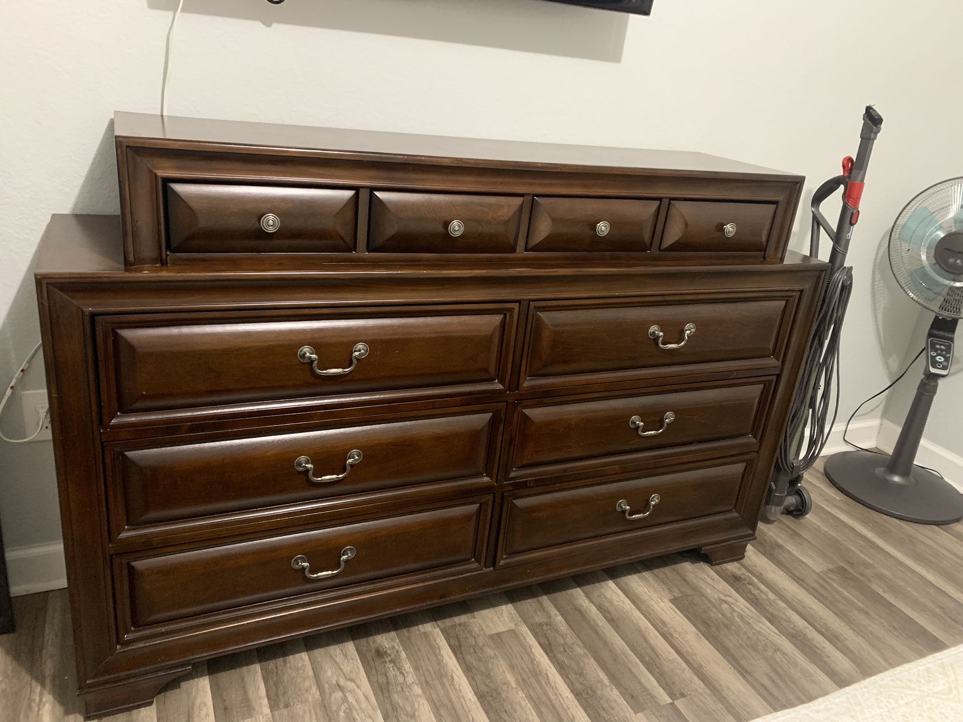 Great condition, Dresser with mirror and 2 night stands. Solid wood. Dresser size 57”L 17D x40”H plus mirror Night stand size 26L x 17 D x 28H Negotiable!