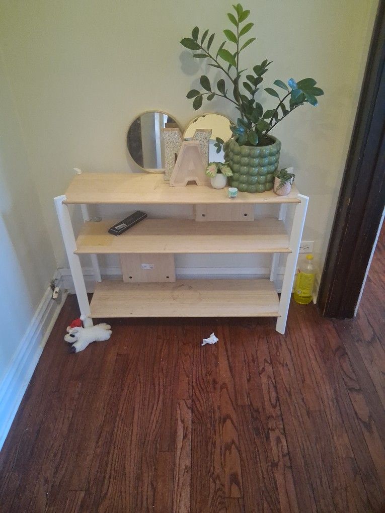 Tan wooden shelf/storage thing Little dusty , will clean before exchange No damage OBO