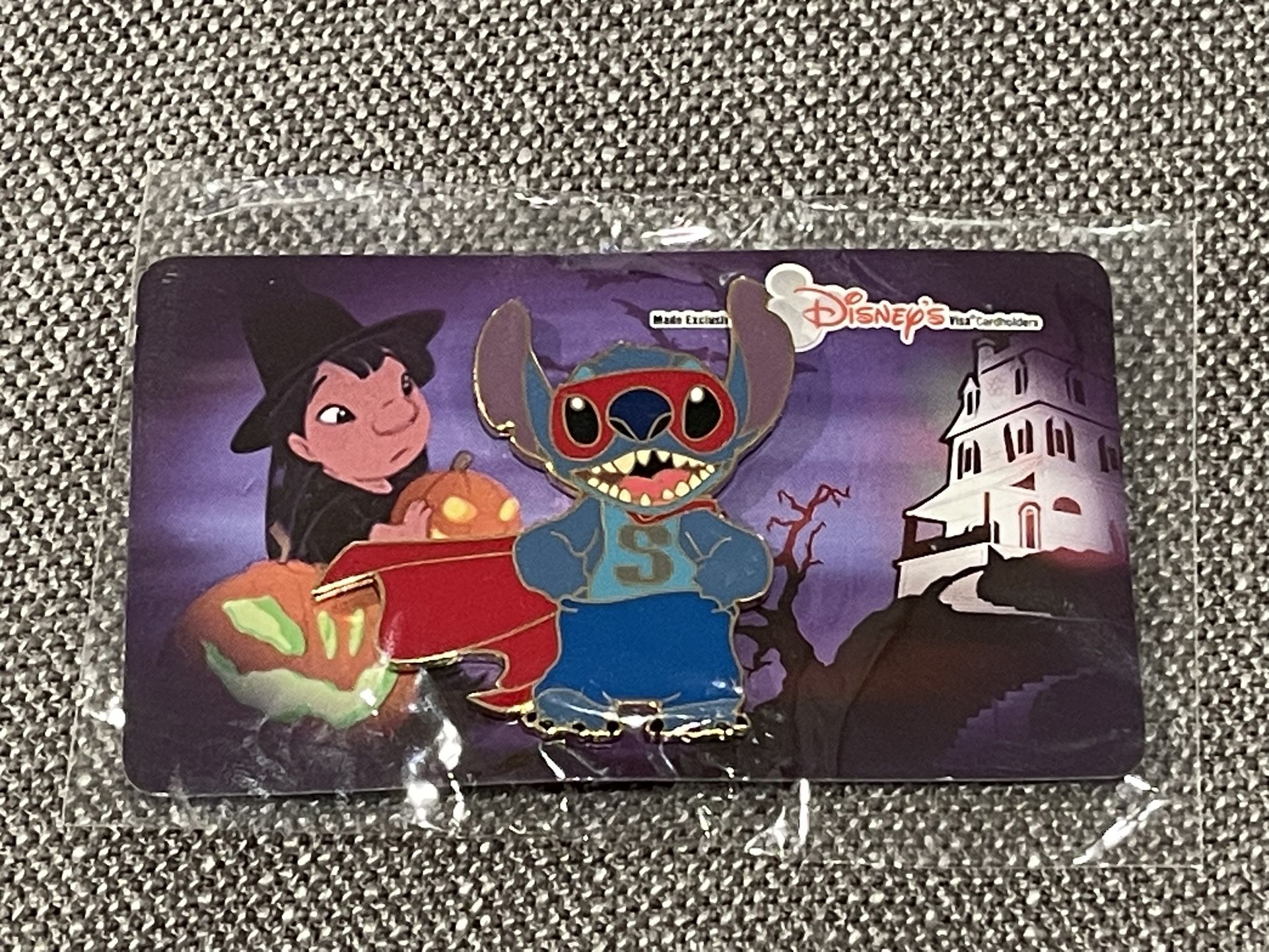 NOC Disney's Chase Visa Cardmember Exclusive #9 Super Hero Stitch Pin Released 2005 PinPics 39882 This pin features Stitch, from Disney’s Lilo & Stitch, dressed for Halloween as a Super Hero, with Mask, Cape and "S" Blazoned Shirt. Pin measures approximately 1.75” X 1.5". It’s attached to a credit card sized backer card that features Lilo dressed up in a witch costume and holding a carved pumpkin or jack-o-lantern. A spooky house is on the right and on the left is another carved pumpkin. Back of pin says: "Official Pin Trading 2005" "Disney's Visa Card Limited Edition" "Disney" "Made in China" DLR SKU: (contact info removed)42619 WDW SKU: 10915648 Excellent condition. New in original packaging. Never opened or removed from packaging or backer card. Please carefully review photos; they are an important part of the description and best show the condition of the item.