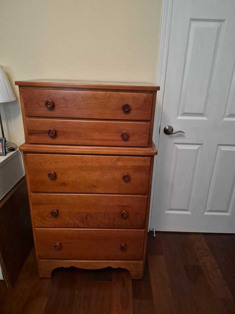 Twin beds that can be bunk beds, dresser, vanity with mirror and new mattresses. In good condition.