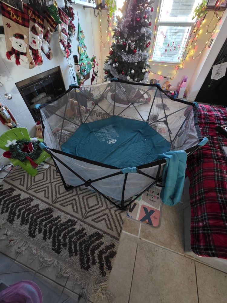 Fully functional kids play pen. Measures about 5 ½ feet from corner to corner. Perfect for parks, beaches, living rooms, or yards.