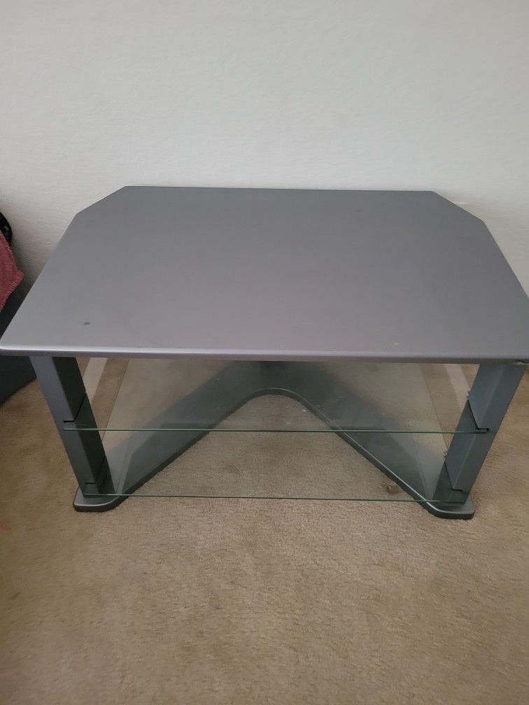 This item is used. The dimensions are Length 35 3/4 Width 23 5/8 Height 19 1/2. Solid tv stand with glass shelving. Good for use in any room.
