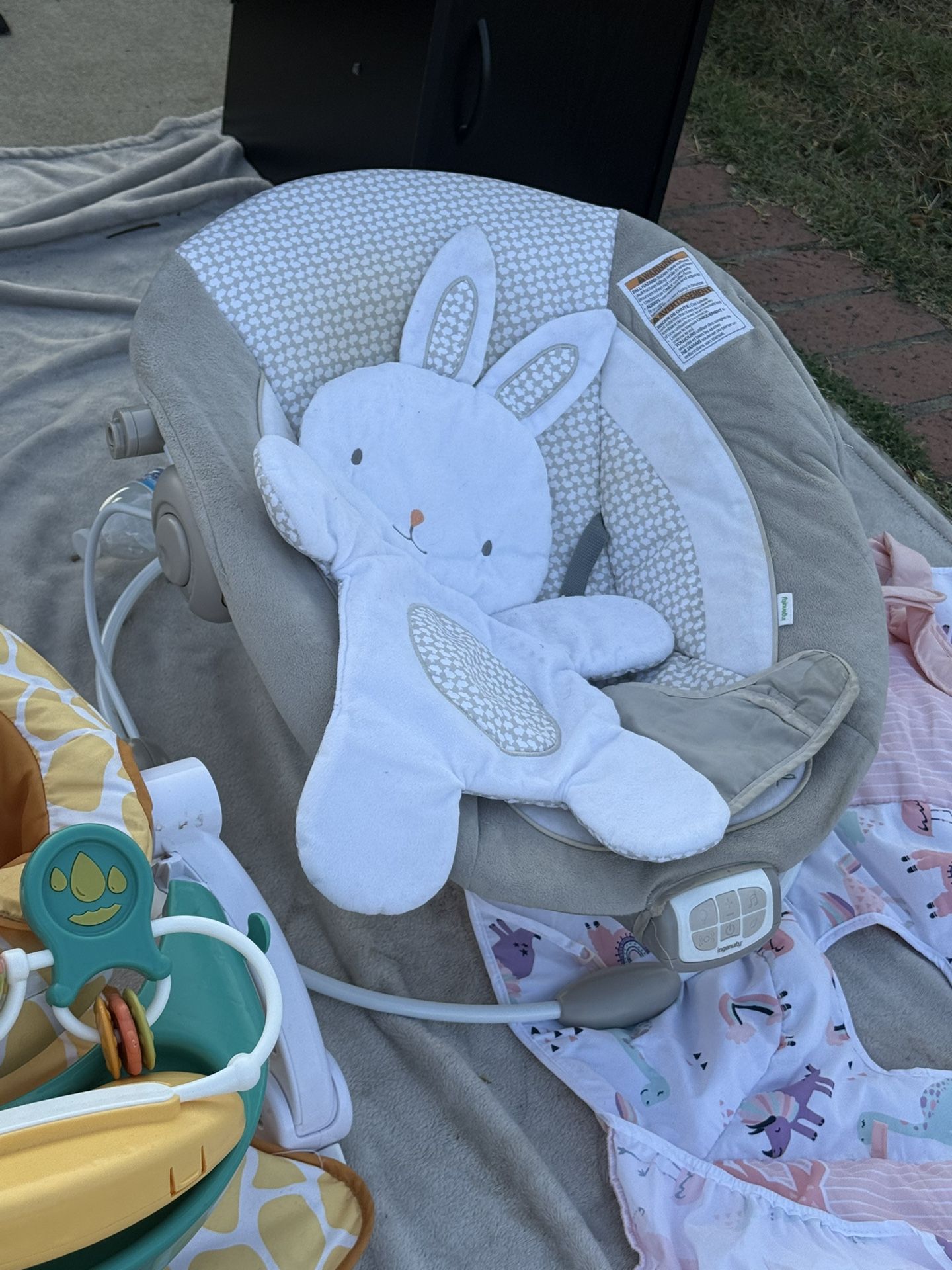 Baby bouncer just needs new batteries, washable cover. Comes with bunny that can be used as a tummy time mat.