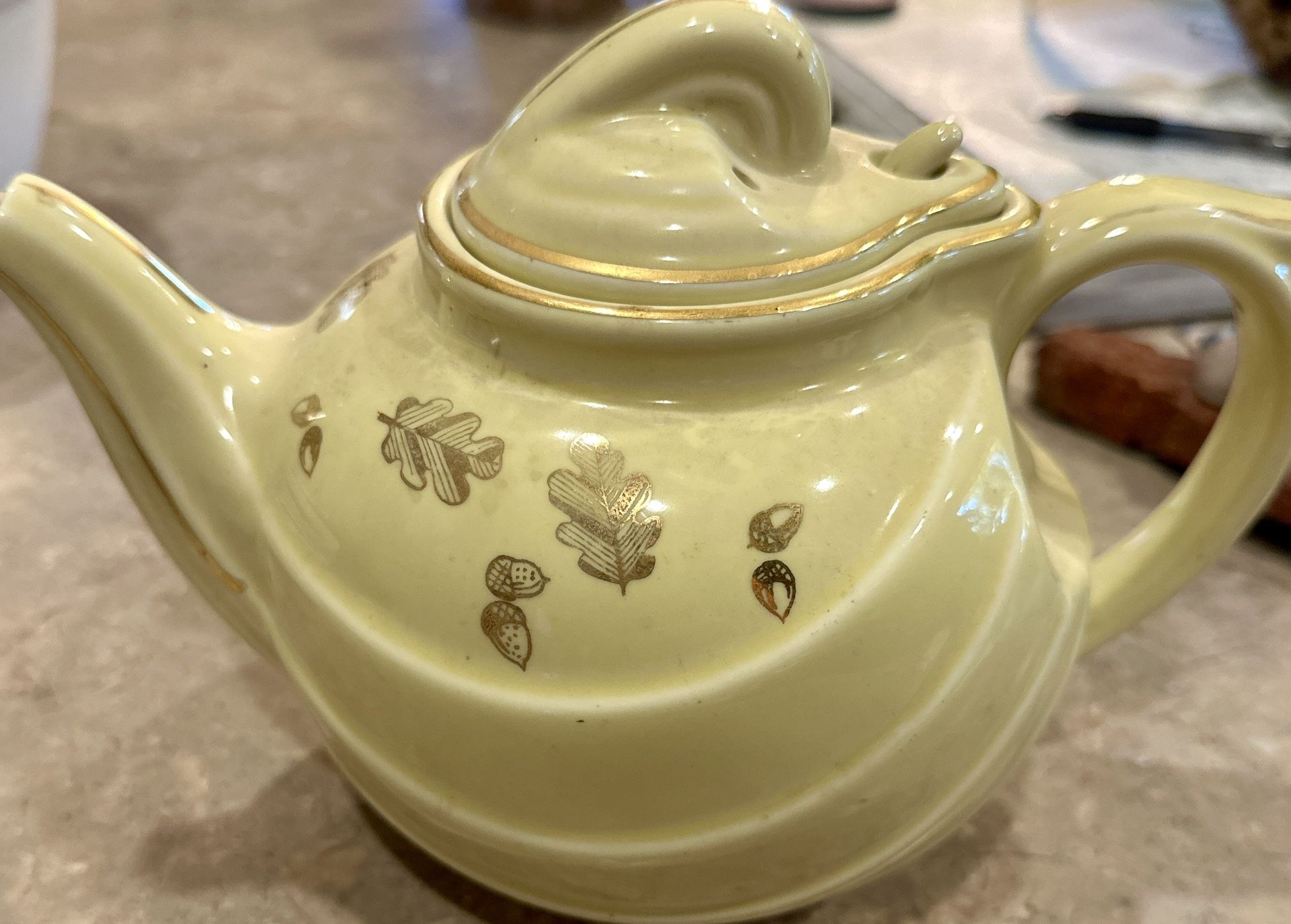 ✨ Vintage Hall China 6-Cup Teapot – Yellow with Gold Leaf Pattern (USA Made)
