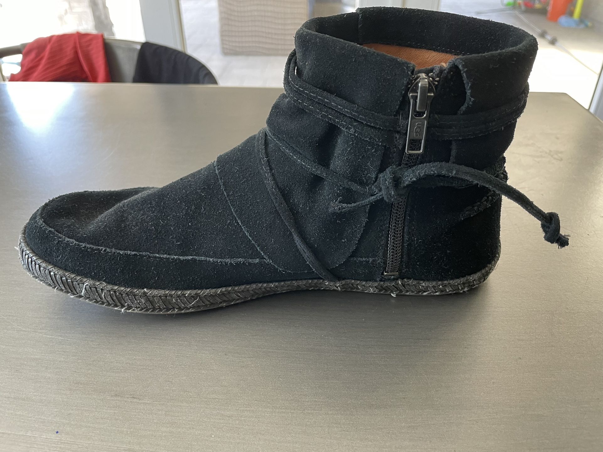 Ugg boots size 8.5. Great condition but on one shoe the decorative leather string is damaged. I almost cut them off because they tend to come untied anyway but tied it and it worked better than the longer string.