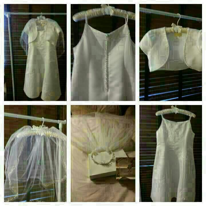 White tea length gown with beaded spaghetti straps some beads on the gown buttons up on the back. Bust 17", waist 17", hips 21 ", children size 12 or XL , cropped short sleeve jacket double veil with tiara and hair secure combs, 8 invitations