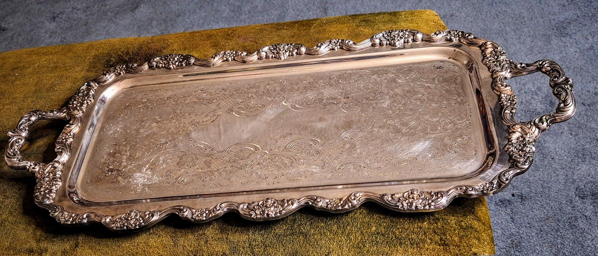 Vintage silver plated serving tray has little feet on the bottom and it's nice and heavy. Asking 60 firm. Located in BOULDER CITY and must pick up please or will deliver for small fee. X posted fcfs and no holds.