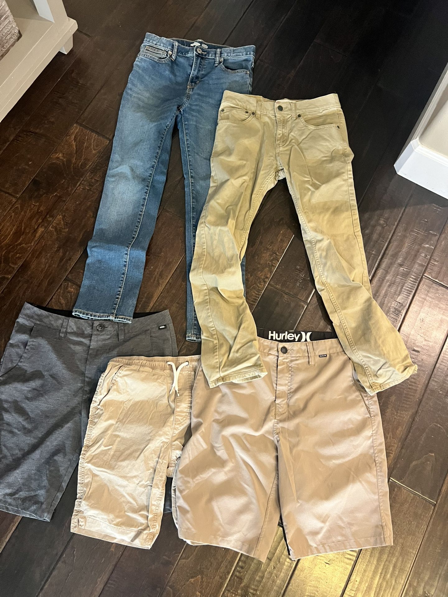 Variety of boys clothing sizes 10-14 Pants Shorts Shirts Jackets Long sleeved shirts Name brands: Nike, Vans, Hurley, Quiksilver, Hollister, Levi’s, Under Armor, Adidas