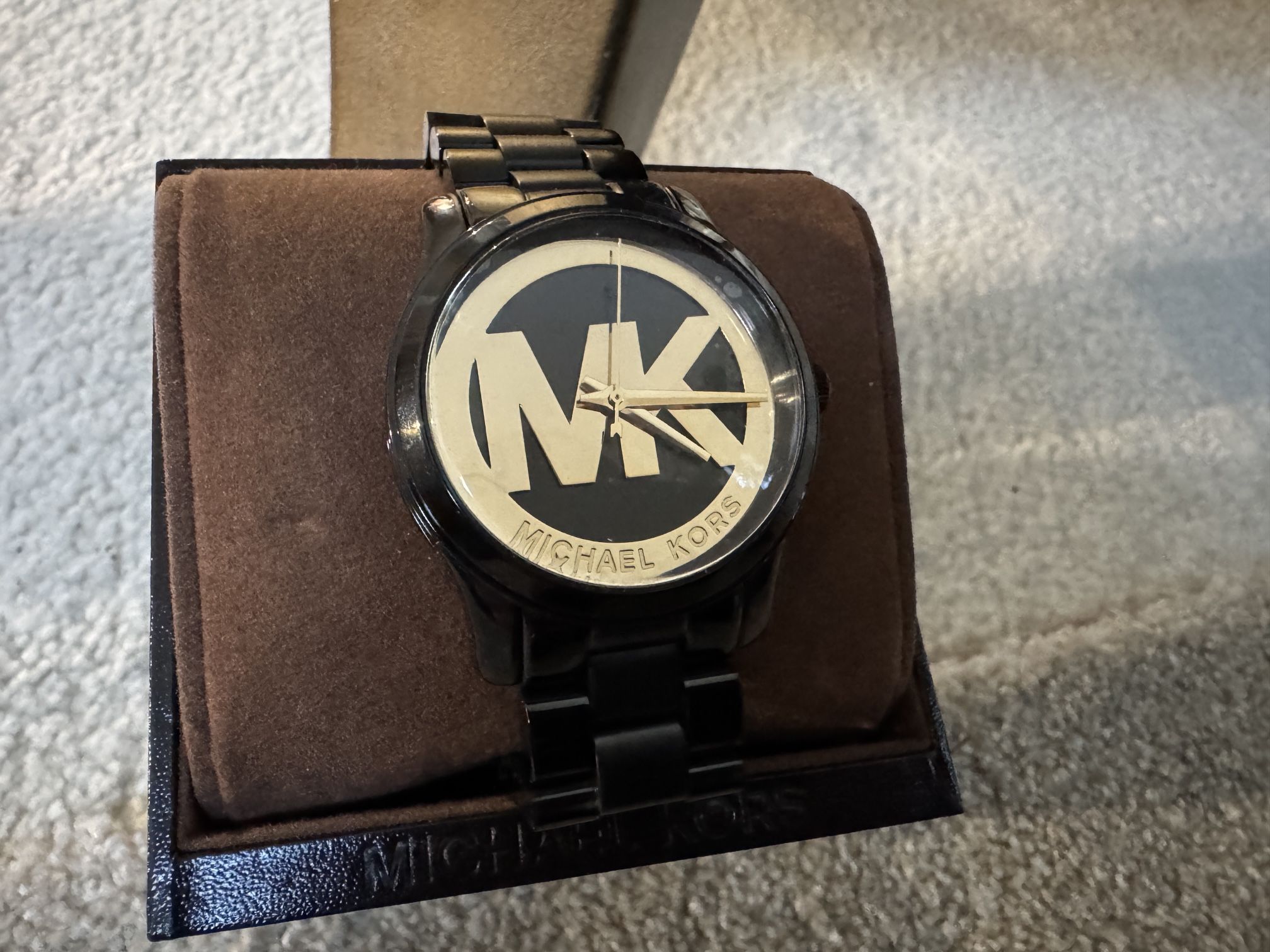 New in box. Asking $90 Michael Kors Women's MK6057 Runway Black Ion-Plated Quartz Watch. It features a black ion-plated stainless steel case and bracelet, a black and gold MK logo dial with gold-tone hands, and scratch-resistant mineral crystal. Key Details & Features Brand Michael Kors Model Number MK6057 Movement Quartz (Japanese Movement) Case Size 34 mm diameter Case & Band Material Ion-plated stainless steel Dial Color Black and gold (MK logo) Water Resistance 30 meters / 100 feet Display Analog Retails for $225