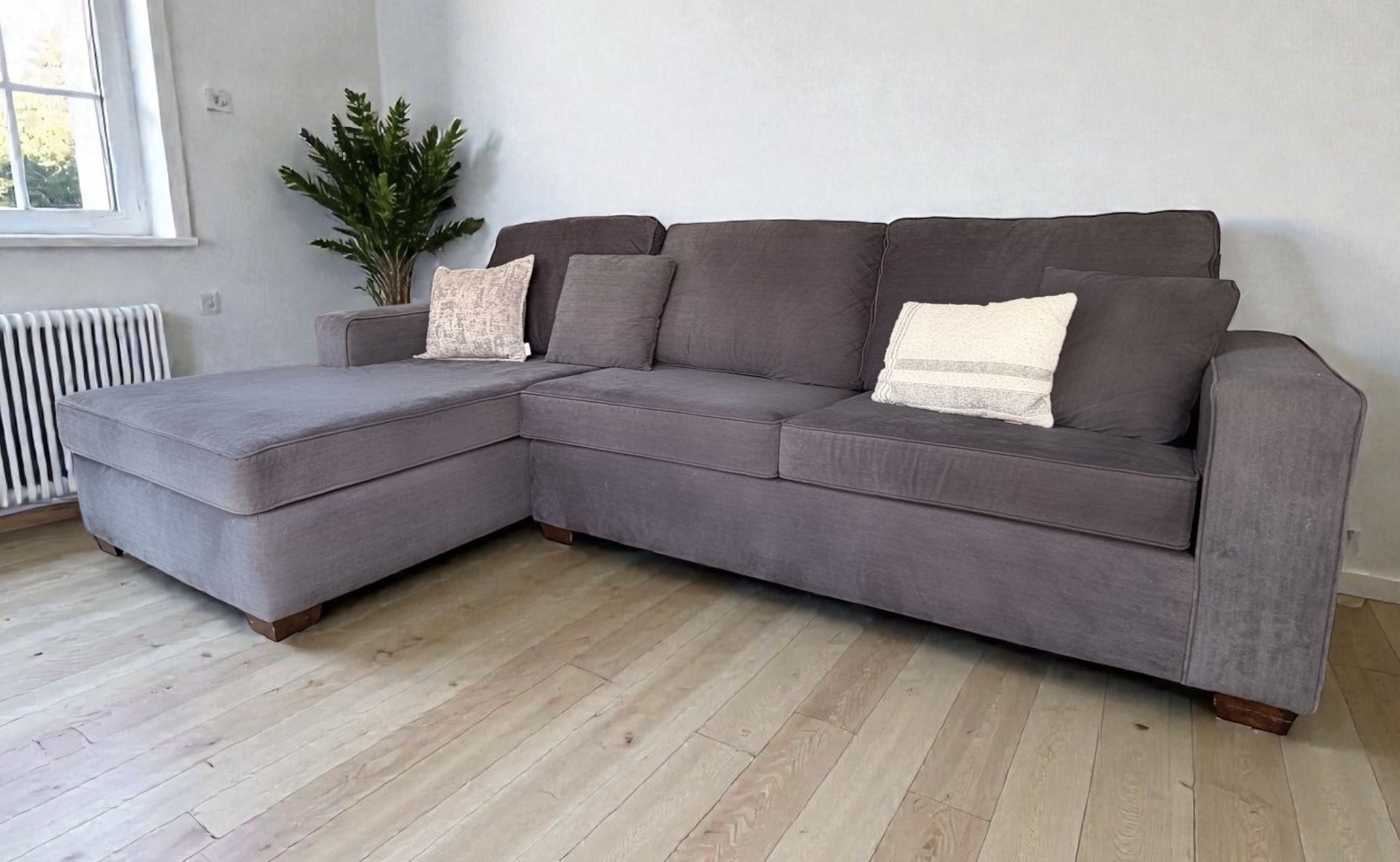 L shape couch- from furniture store in San Jose Very good quality, fabric is super soft! Color is a blue gray ALL cushion covers can be washed (they are freshly washed for pickup) It’s very comfy! No stains See picture for very small scratch in arm rest. Delivery available for a fee