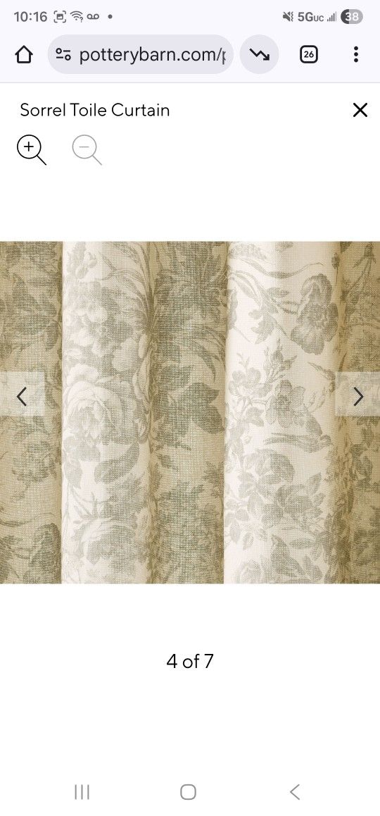 Pottery Barn Sorrel Toile curtains in green and beige (Loden). 50" x 108" per panel. I am selling 2 panels for $450, or 4 for $800. I paid $916 + tax. Selling because I no longer need them, and I was not able to return to Pottery Barn given their 30-day return policy. They are so beautiful! I wish I still had a need for them/could use them somehow. Note: The items are still in the original packaging unopened.