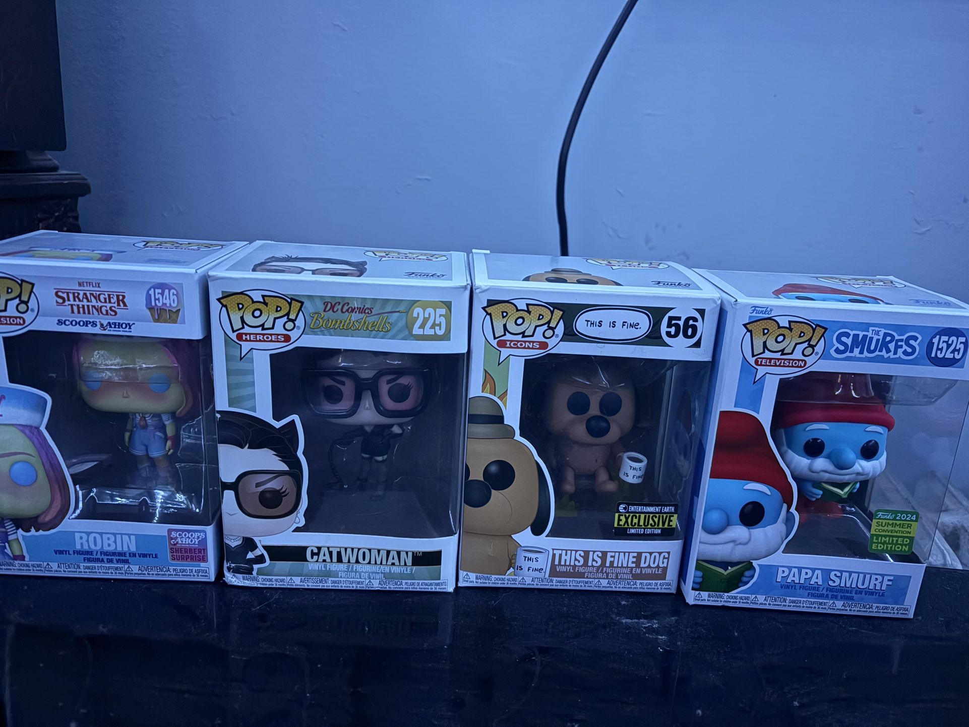 Funko Pops (cat Woman, This Is Fine Dog, Papa Smurf, Robin)